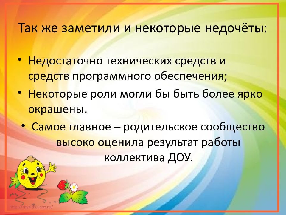Недостаточно технических средств и средств программного обеспечения; Некоторые роли могли бы быть более ярко окрашены. Самое главное – родительское сообщество высоко оценила результат работы коллектива ДОУ.