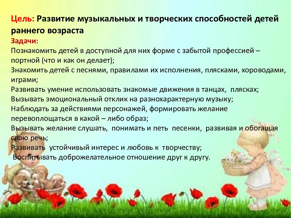 Цель: Развитие музыкальных и творческих способностей детей раннего возраста Задачи: Познакомить детей в доступной для них форме с забытой профессией – портной (что и как он делает); Знакомить детей с песнями, правилами их исполнения, плясками, хороводами, играми ; Развивать умение использовать знакомые движения в танцах, плясках; Вызывать эмоциональный отклик на разнохарактерную музыку; Наблюдать за действиями персонажей, формировать желание перевоплощаться в какой – либо образ; Вызывать желание слушать, понимать и петь песенки, развивая и обогащая свою речь ; Развивать устойчивый интерес и любовь к творчеству; Воспитывать доброжелательное отношение друг к другу.