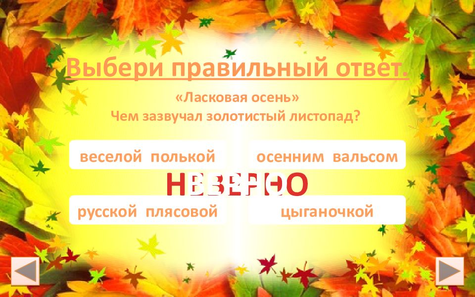 Выбери правильный ответ. «Ласковая осень» Чем зазвучал золотистый листопад? осенним вальсом веселой полькой русской плясовой цыганочкой НЕВЕРНО ВЕРНО