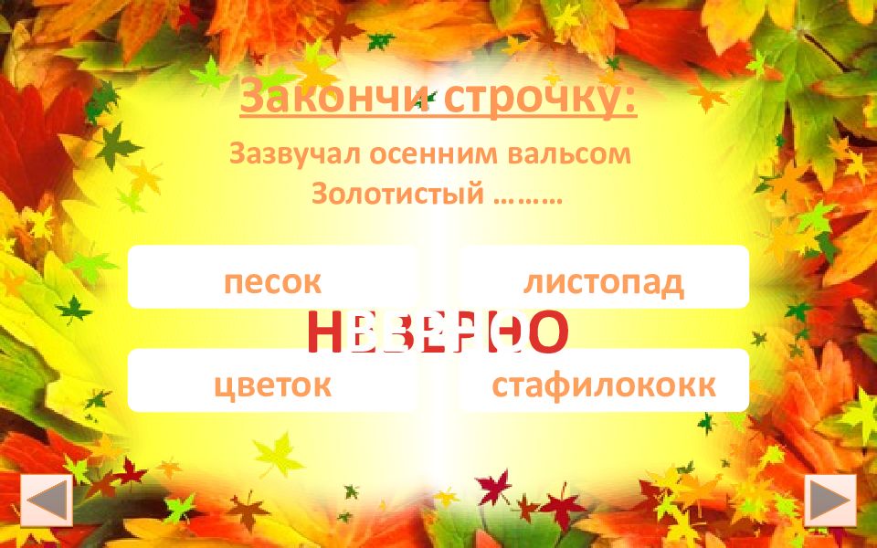 Закончи строчку: Зазвучал осенним вальсом Золотистый ……… листопад песок цветок стафилококк НЕВЕРНО ВЕРНО
