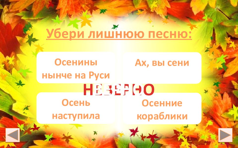 Убери лишнюю песню: Ах, вы сени Осенние кораблики Осень наступила Осенины нынче на Руси НЕВЕРНО ВЕРНО