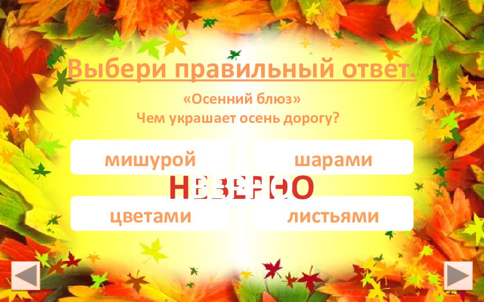 Выбери правильный ответ. «Осенний блюз» Чем украшает осень дорогу? листьями шарами цветами мишурой НЕВЕРНО ВЕРНО
