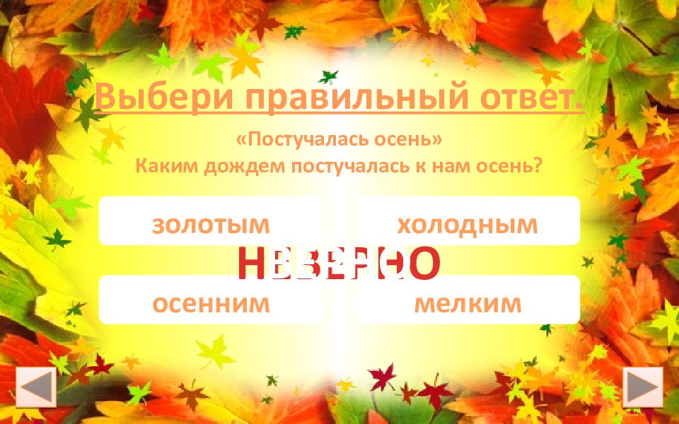 Выбери правильный ответ. «Постучалась осень» Каким дождем постучалась к нам осень? золотым холодным осенним мелким НЕВЕРНО ВЕРНО