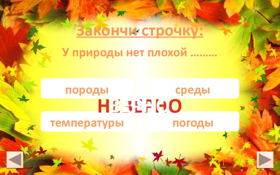 Закончи строчку: У природы нет плохой ……… погоды среды температуры породы НЕВЕРНО ВЕРНО