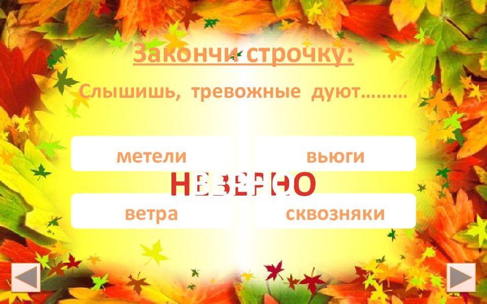 Выбери правильный ответ. «Листья желтые» Над чем кружатся листья желтые? над городом над домом над машиной над лесом НЕВЕРНО ВЕРНО