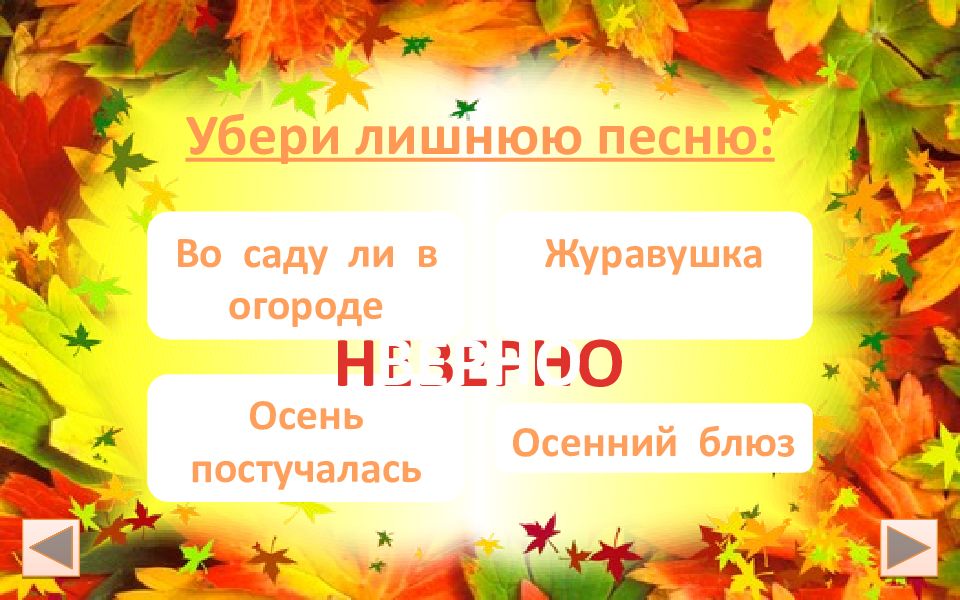 Убери лишнюю песню: Во саду ли в огороде Журавушка Осень постучалась Осенний блюз НЕВЕРНО ВЕРНО