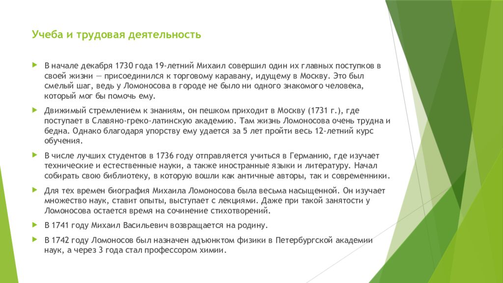 В начале декабря 1730 года 19-летний Михаил совершил один их главных поступков в своей жизни — присоединился к торговому каравану, идущему в Москву. Это был смелый шаг, ведь у Ломоносова в городе не было ни одного знакомого человека, который мог бы помочь ему. Движимый стремлением к знаниям, он пешком приходит в Москву (1731 г.), где поступает в Славяно-греко-латинскую академию. Там жизнь Ломоносова очень трудна и бедна. Однако благодаря упорству ему удается за 5 лет пройти весь 12-летний курс обучения. В числе лучших студентов в 1736 году отправляется учиться в Германию, где изучает технические и естественные науки, а также иностранные языки и литературу. Начал собирать свою библиотеку, в которую вошли как античные авторы, так и современники. Для тех времен биография Михаила Ломоносова была весьма насыщенной. Он изучает множество наук, ставит опыты, выступает с лекциями. Даже при такой занятости у Ломоносова остается время на сочинение стихотворений. В 1741 году Михаил Васильевич возвращается на родину. В 1742 году Ломоносов был назначен адъюнктом физики в Петербургской академии наук, а через 3 года стал профессором химии.