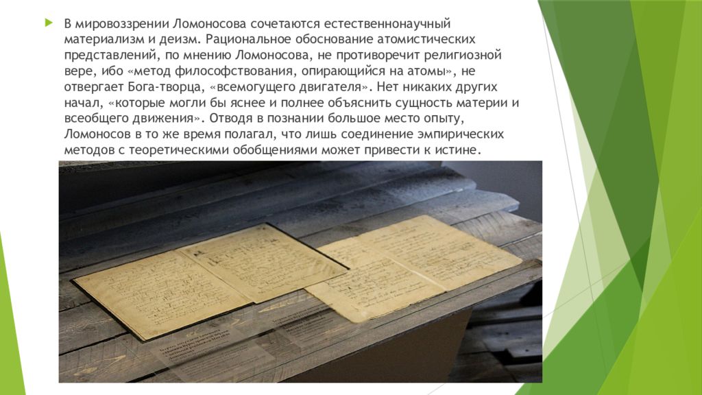 В мировоззрении Ломоносова сочетаются естественнонаучный материализм и деизм. Рациональное обоснование атомистических представлений, по мнению Ломоносова, не противоречит религиозной вере, ибо «метод философствования, опирающийся на атомы», не отвергает Бога-творца, «всемогущего двигателя». Нет никаких других начал, «которые могли бы яснее и полнее объяснить сущность материи и всеобщего движения». Отводя в познании большое место опыту, Ломоносов в то же время полагал, что лишь соединение эмпирических методов с теоретическими обобщениями может привести к истине.