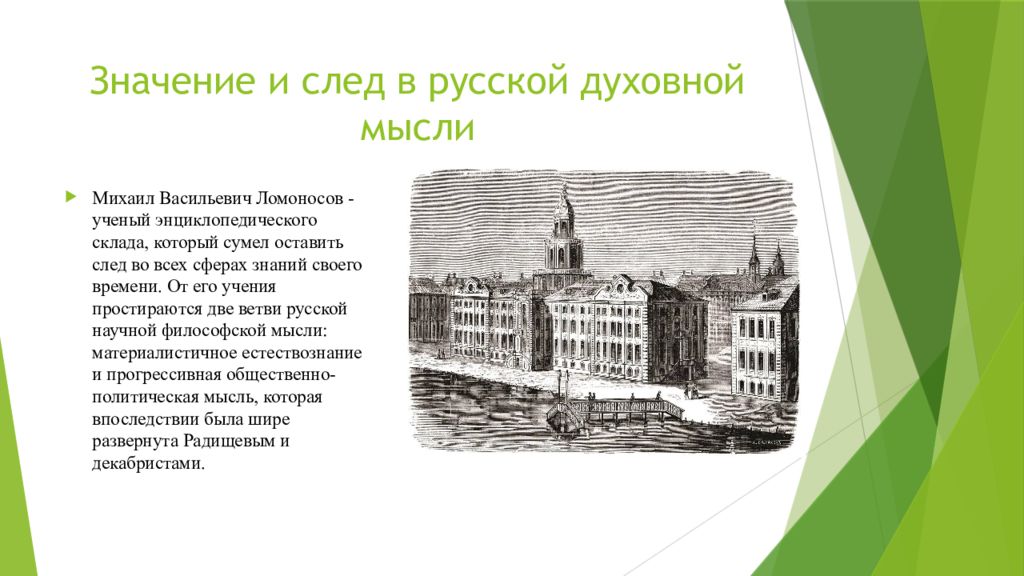 Михаил Васильевич Ломоносов - ученый энциклопедического склада, который сумел оставить след во всех сферах знаний своего времени. От его учения простираются две ветви русской научной философской мысли: материалистичное естествознание и прогрессивная общественно-политическая мысль, которая впоследствии была шире развернута Радищевым и декабристами.