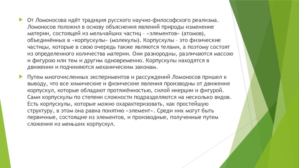 От Ломоносова идёт традиция русского научно-философского реализма. Ломоносов положил в основу объяснения явлений природы изменение материи, состоящей из мельчайших частиц – «элементов» (атомов), объединённых в «корпускулы» (молекулы). Корпускулы – это физические частицы, которые в свою очередь также являются телами, а поэтому состоят из определенного количества материи. Они разнородны, различаются массою и фигурою или тем и другим одновременно. Корпускулы находятся в движении и подчиняются механическим законам. Путем многочисленных экспериментов и рассуждений Ломоносов пришел к выводу, что все химические и физические явления производны от движения корпускул, которые обладают протяжённостью, силой инерции и фигурой. Сами корпускулы по степени сложности подразделяются на несколько видов. Есть корпускулы, которые можно охарактеризовать, как простейшую структуру, в этом она равна понятию «элемент». Среди них могут быть первичные, состоящие из элементов, и производные, полученные путем сложения из меньших корпускул.