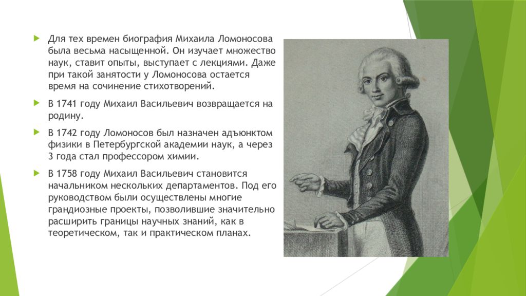 Для тех времен биография Михаила Ломоносова была весьма насыщенной. Он изучает множество наук, ставит опыты, выступает с лекциями. Даже при такой занятости у Ломоносова остается время на сочинение стихотворений. В 1741 году Михаил Васильевич возвращается на родину. В 1742 году Ломоносов был назначен адъюнктом физики в Петербургской академии наук, а через 3 года стал профессором химии. В 1758 году Михаил Васильевич становится начальником нескольких департаментов. Под его руководством были осуществлены многие грандиозные проекты, позволившие значительно расширить границы научных знаний, как в теоретическом, так и практическом планах.
