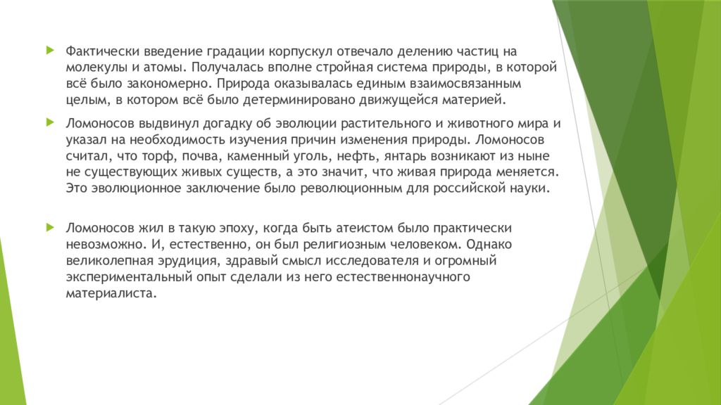 Фактически введение градации корпускул отвечало делению частиц на молекулы и атомы. Получалась вполне стройная система природы, в которой всё было закономерно. Природа оказывалась единым взаимосвязанным целым, в котором всё было детерминировано движущейся материей. Ломоносов выдвинул догадку об эволюции растительного и животного мира и указал на необходимость изучения причин изменения природы. Ломоносов считал, что торф, почва, каменный уголь, нефть, янтарь возникают из ныне не существующих живых существ, а это значит, что живая природа меняется. Это эволюционное заключение было революционным для российской науки. Ломоносов жил в такую эпоху, когда быть атеистом было практически невозможно. И, естественно, он был религиозным человеком. Однако великолепная эрудиция, здравый смысл исследователя и огромный экспериментальный опыт сделали из него естественнонаучного материалиста.