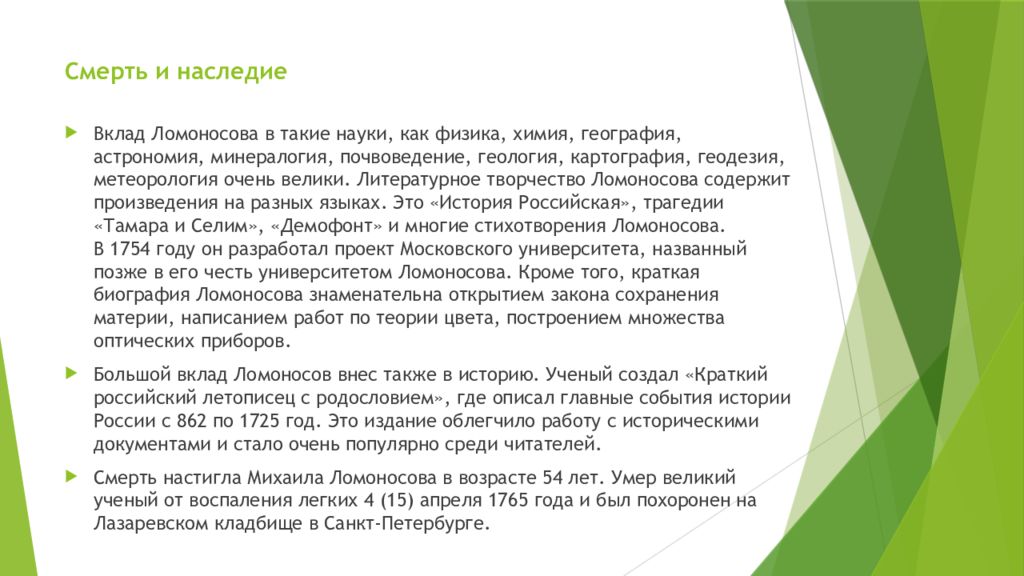 Вклад Ломоносова в такие науки, как физика, химия, география, астрономия, минералогия, почвоведение, геология, картография, геодезия, метеорология очень велики. Литературное творчество Ломоносова содержит произведения на разных языках. Это «История Российская», трагедии «Тамара и Селим», « Демофонт » и многие стихотворения Ломоносова. В 1754 году он разработал проект Московского университета, названный позже в его честь университетом Ломоносова. Кроме того, краткая биография Ломоносова знаменательна открытием закона сохранения материи, написанием работ по теории цвета, построением множества оптических приборов. Большой вклад Ломоносов внес также в историю. Ученый создал «Краткий российский летописец с родословием», где описал главные события истории России с 862 по 1725 год. Это издание облегчило работу с историческими документами и стало очень популярно среди читателей. Смерть настигла Михаила Ломоносова в возрасте 54 лет. Умер великий ученый от воспаления легких 4 (15) апреля 1765 года и был похоронен на Лазаревском кладбище в Санкт-Петербурге.