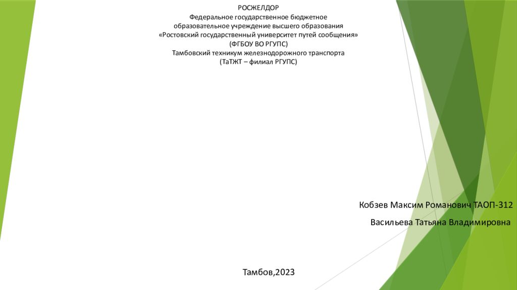 Кобзев Максим Романович ТАОП-312 Васильева Татьяна Владимировна РОСЖЕЛДОР Федеральное государственное бюджетное образовательное учреждение высшего образования «Ростовский государственный университет путей сообщения» (ФГБОУ ВО РГУПС) Тамбовский техникум железнодорожного транспорта ( ТаТЖТ – филиал РГУПС) Тамбов,2023