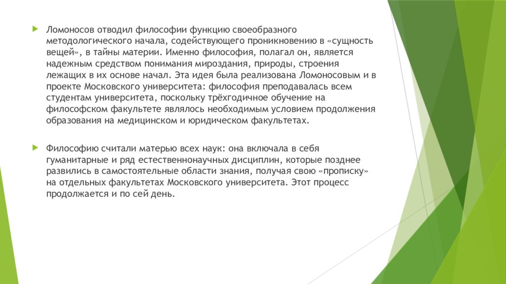 Ломоносов отводил философии функцию своеобразного методологического начала, содействующего проникновению в «сущность вещей», в тайны материи. Именно философия, полагал он, является надежным средством понимания мироздания, природы, строения лежащих в их основе начал. Эта идея была реализована Ломоносовым и в проекте Московского университета: философия преподавалась всем студентам университета, поскольку трёхгодичное обучение на философском факультете являлось необходимым условием продолжения образования на медицинском и юридическом факультетах. Философию считали матерью всех наук: она включала в себя гуманитарные и ряд естественнонаучных дисциплин, которые позднее развились в самостоятельные области знания, получая свою «прописку» на отдельных факультетах Московского университета. Этот процесс продолжается и по сей день.