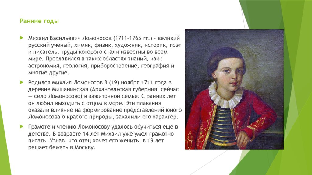 Михаил Васильевич Ломоносов (1711–1765 гг.) – великий русский ученый, химик, физик, художник, историк, поэт и писатель, труды которого стали известны во всем мире. Прославился в таких областях знаний, как : астрономия, геология, приборостроение, география и многие другие. Родился Михаил Ломоносов 8 (19) ноября 1711 года в деревне Мишанинская (Архангельская губерния, сейчас — село Ломоносово ) в зажиточной семье. С ранних лет он любил выходить с отцом в море. Эти плавания оказали влияние на формирование представлений юного Ломоносова о красоте природы, закалили его характер. Грамоте и чтению Ломоносову удалось обучиться еще в детстве. В возрасте 14 лет Михаил уже умел грамотно писать. Узнав, что отец хочет его женить, в 19 лет решает бежать в Москву.
