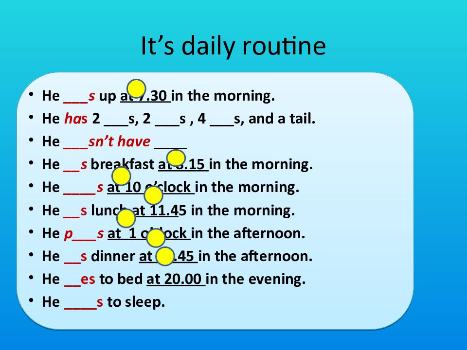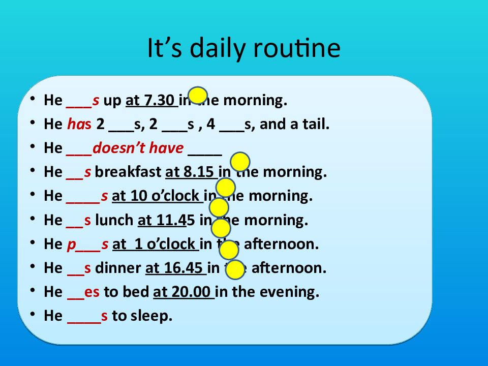 He ___ s up at 7.30 in the morning. He ha s 2 ___s, 2 ___s, 4 ___s, and a tail. He ___ sn’t have ____ He __s breakfast at 8.15 in the morning. He ____s at 10 o’clock in the morning. He __ s lunch at 11.4 5 in the morning. He p ___s at 1 o’clock in the afternoon. He __s dinner at 16.45 in the afternoon. He __ es to bed at 20.00 in the evening. He ____s to sleep.