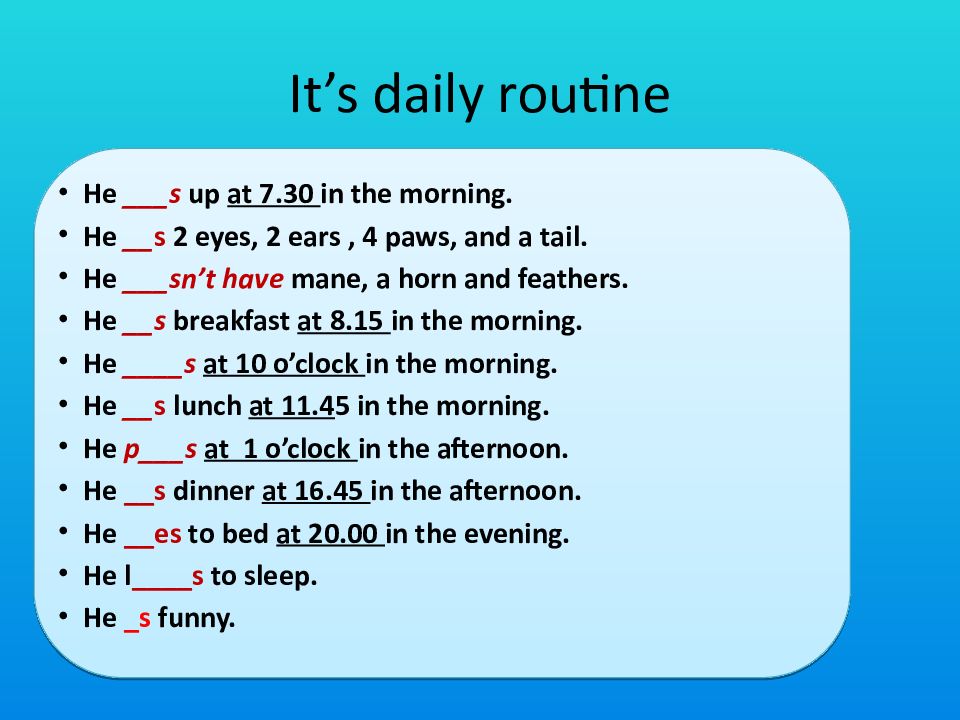 He ___ s up at 7.30 in the morning. He __ s 2 eyes, 2 ears, 4 paws, and a tail. He ___ sn’t have mane, a horn and feathers. He __s breakfast at 8.15 in the morning. He ____s at 10 o’clock in the morning. He __ s lunch at 11.4 5 in the morning. He p ___s at 1 o’clock in the afternoon. He __s dinner at 16.45 in the afternoon. He __ es to bed at 20.00 in the evening. He l ____s to sleep. He _s funny.