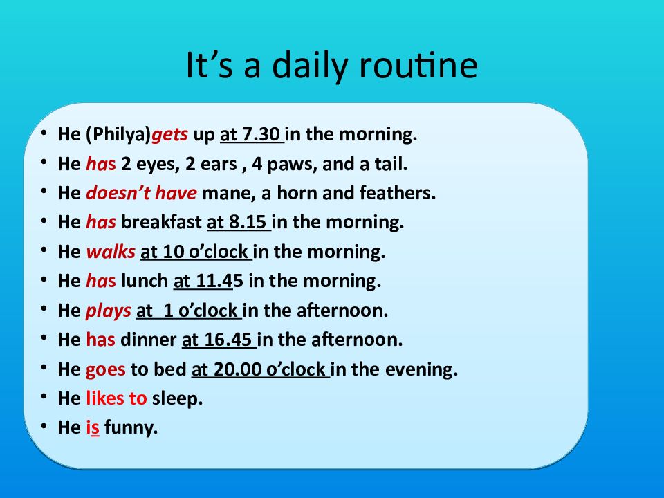 He ( Philya ) gets up at 7.30 in the morning. He ha s 2 eyes, 2 ears, 4 paws, and a tail. He doesn’t have mane, a horn and feathers. He has breakfast at 8.15 in the morning. He walks at 10 o’clock in the morning. He ha s lunch at 11.4 5 in the morning. He plays at 1 o’clock in the afternoon. He has dinner at 16.45 in the afternoon. He goes to bed at 20.00 o’clock in the evening. He likes to sleep. He i s funny.