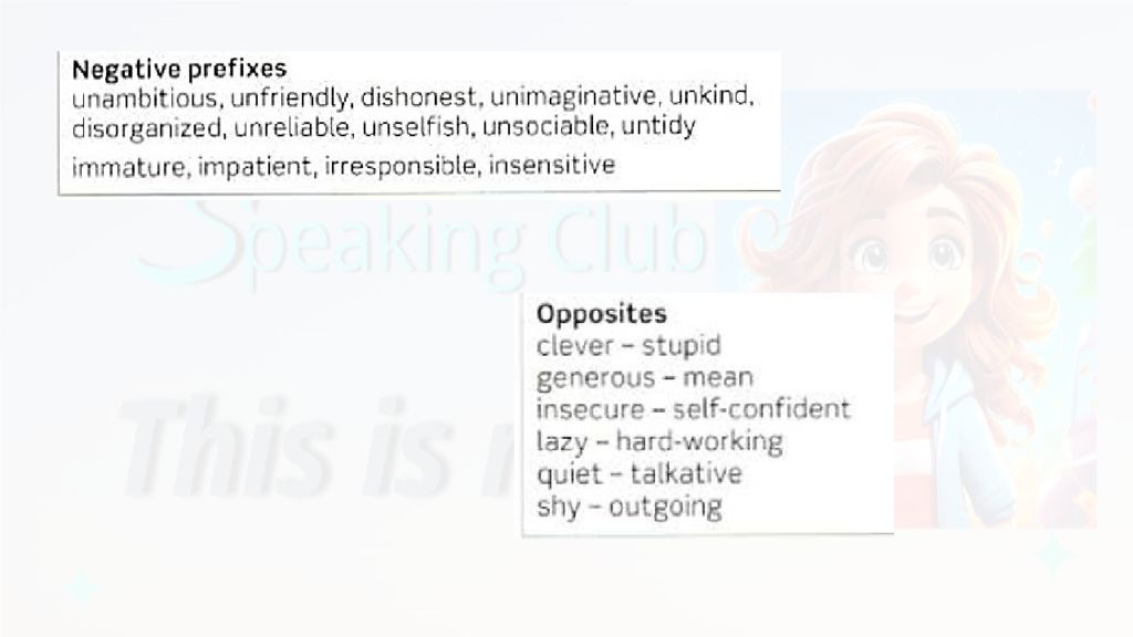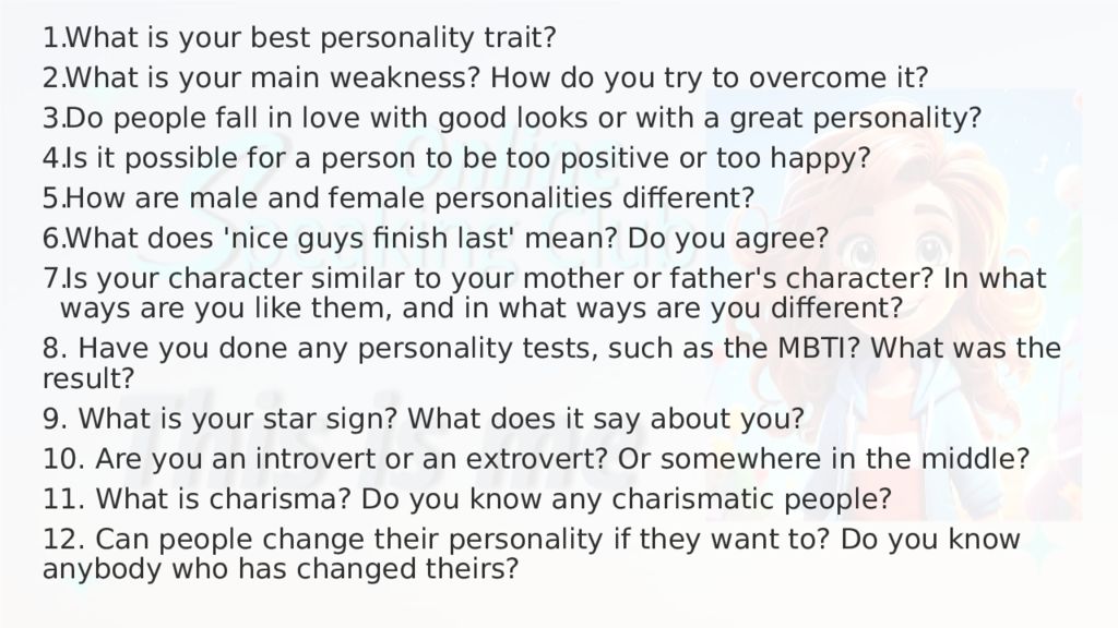 What is your best personality trait? What is your main weakness? How do you try to overcome it? Do people fall in love with good looks or with a great personality? Is it possible for a person to be too positive or too happy? How are male and female personalities different? What does 'nice guys finish last' mean? Do you agree? Is your character similar to your mother or father's character? In what ways are you like them, and in what ways are you different? 8. Have you done any personality tests, such as the MBTI? What was the result? 9. What is your star sign? What does it say about you? 10. Are you an introvert or an extrovert? Or somewhere in the middle? 11. What is charisma? Do you know any charismatic people? 12. Can people change their personality if they want to? Do you know anybody who has changed theirs?