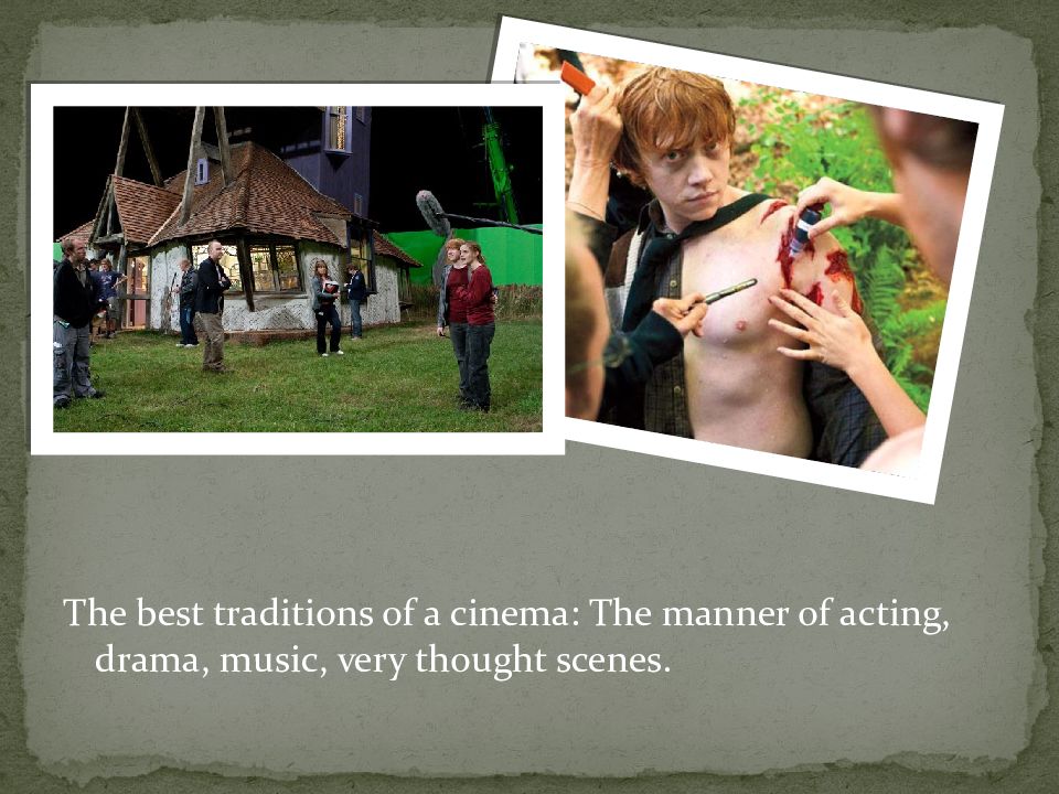 The best traditions of a cinema: The manner of acting, drama, music, very thought scenes.