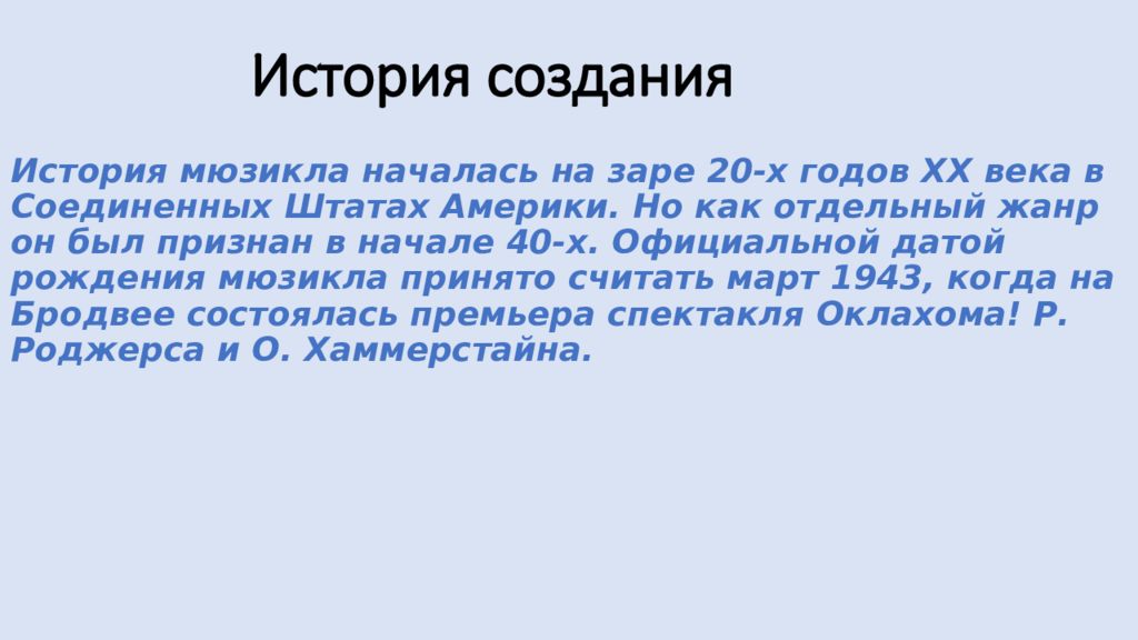 История мюзикла началась на заре 20-х годов XX века в Соединенных Штатах Америки. Но как отдельный жанр он был признан в начале 40-х. Официальной датой рождения мюзикла принято считать март 1943, когда на Бродвее состоялась премьера спектакля Оклахома! Р. Роджерса и О. Хаммерстайна.