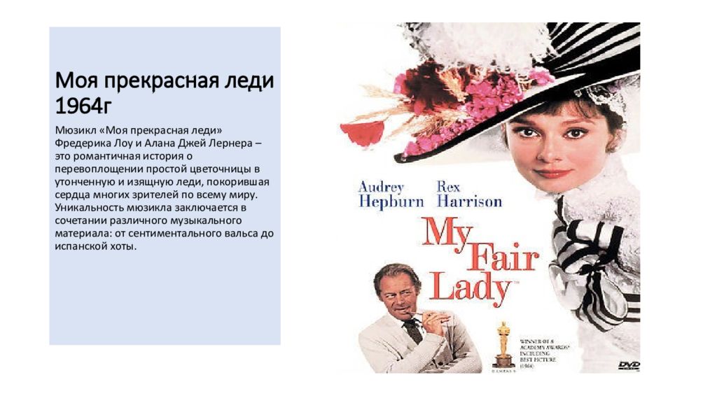 Мюзикл «Моя прекрасная леди» Фредерика Лоу и Алана Джей Лернера – это романтичная история о перевоплощении простой цветочницы в утонченную и изящную леди, покорившая сердца многих зрителей по всему миру. Уникальность мюзикла заключается в сочетании различного музыкального материала: от сентиментального вальса до испанской хоты.