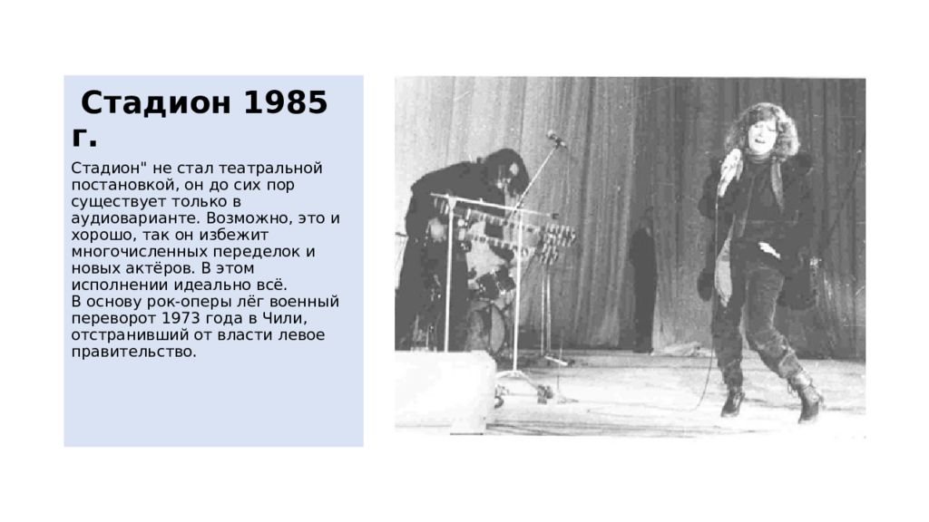 Стадион" не стал театральной постановкой, он до сих пор существует только в аудиоварианте. Возможно, это и хорошо, так он избежит многочисленных переделок и новых актёров. В этом исполнении идеально всё. В основу рок-оперы лёг военный переворот 1973 года в Чили, отстранивший от власти левое правительство.