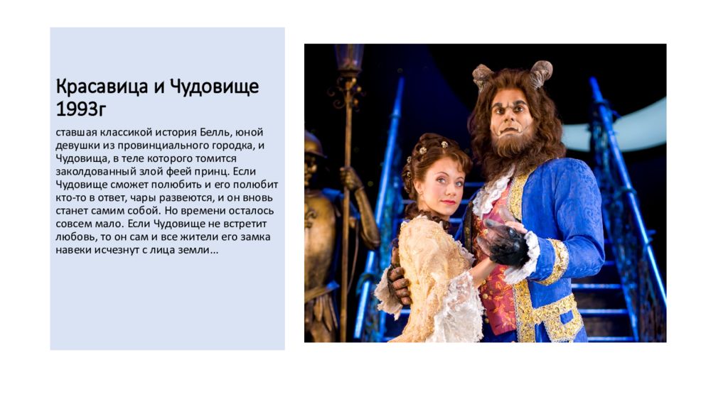 ставшая классикой история Белль, юной девушки из провинциального городка, и Чудовища, в теле которого томится заколдованный злой феей принц. Если Чудовище сможет полюбить и его полюбит кто-то в ответ, чары развеются, и он вновь станет самим собой. Но времени осталось совсем мало. Если Чудовище не встретит любовь, то он сам и все жители его замка навеки исчезнут с лица земли…