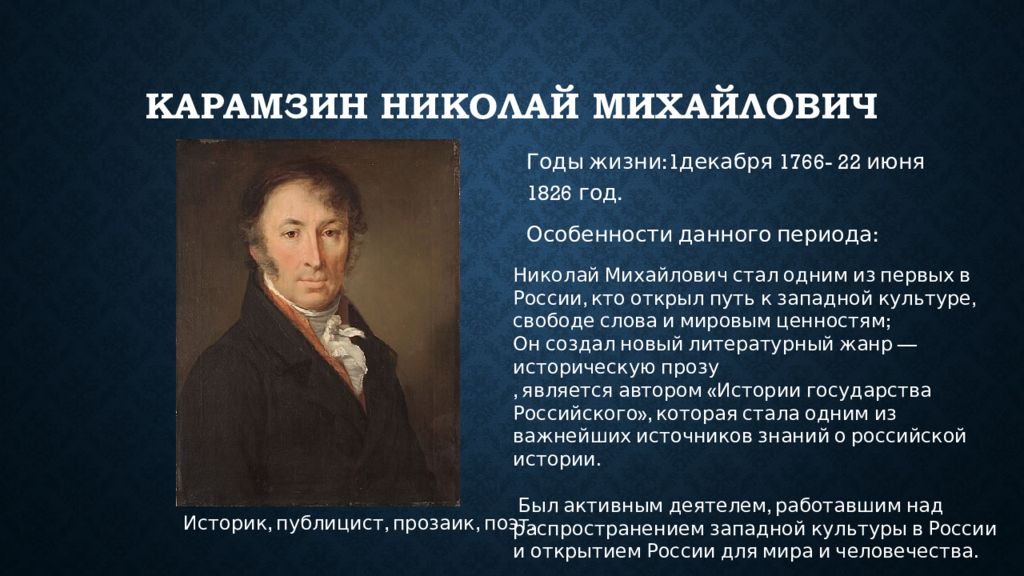 Годы жизни:1декабря 1766- 22 июня 1826 год. Особенности данного периода: Историк, публицист, прозаик, поэт. Николай Михайлович стал одним из первых в России, кто открыл путь к западной культуре, свободе слова и мировым ценностям; Он создал новый литературный жанр — историческую прозу , является автором «Истории государства Российского», которая стала одним из важнейших источников знаний о российской истории. Был активным деятелем, работавшим над распространением западной культуры в России и открытием России для мира и человечества.