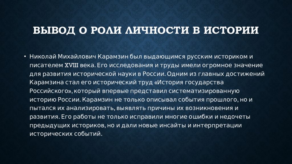 Николай Михайлович Карамзин был выдающимся русским историком и писателем XVIII века. Его исследования и труды имели огромное значение для развития исторической науки в России. Одним из главных достижений Карамзина стал его исторический труд «История государства Российского», который впервые представил систематизированную историю России. Карамзин не только описывал события прошлого, но и пытался их анализировать, выявлять причины их возникновения и развития. Его работы не только исправили многие ошибки и недочеты предыдущих историков, но и дали новые инсайты и интерпретации исторических событий.