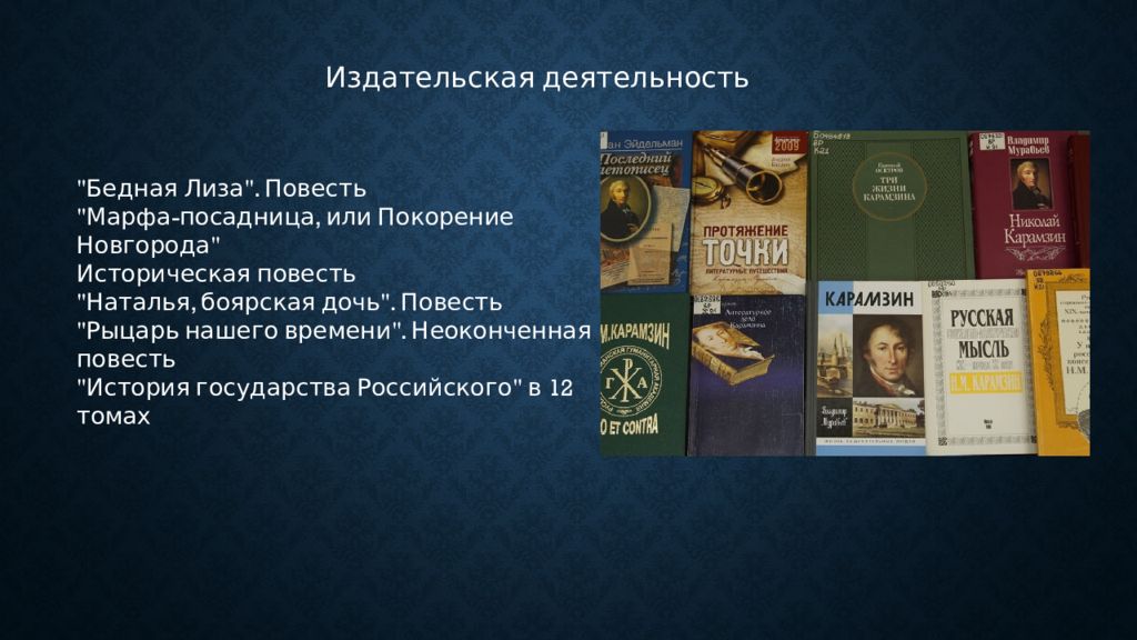 Издательская деятельность "Бедная Лиза". Повесть "Марфа-посадница, или Покорение Новгорода" Историческая повесть "Наталья, боярская дочь". Повесть "Рыцарь нашего времени". Неоконченная повесть "История государства Российского" в 12 томах