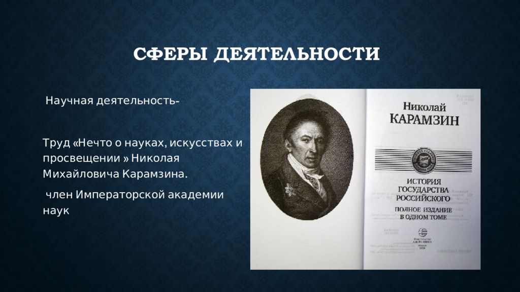 Научная деятельность- Труд «Нечто о науках, искусствах и просвещении » Николая Михайловича Карамзина. член Императорской академии наук