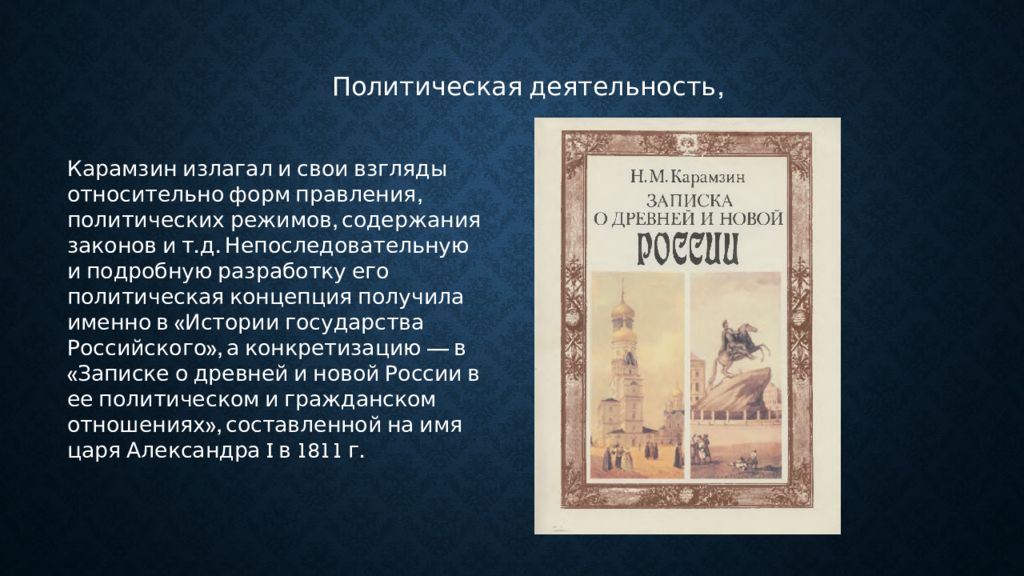 Политическая деятельность, Карамзин излагал и свои взгляды относительно форм правления, политических режимов, содержания законов и т.д. Непоследовательную и подробную разработку его политическая концепция получила именно в «Истории государства Российского», а конкретизацию — в «Записке о древней и новой России в ее политическом и гражданском отношениях», составленной на имя царя Александра I в 1811 г.