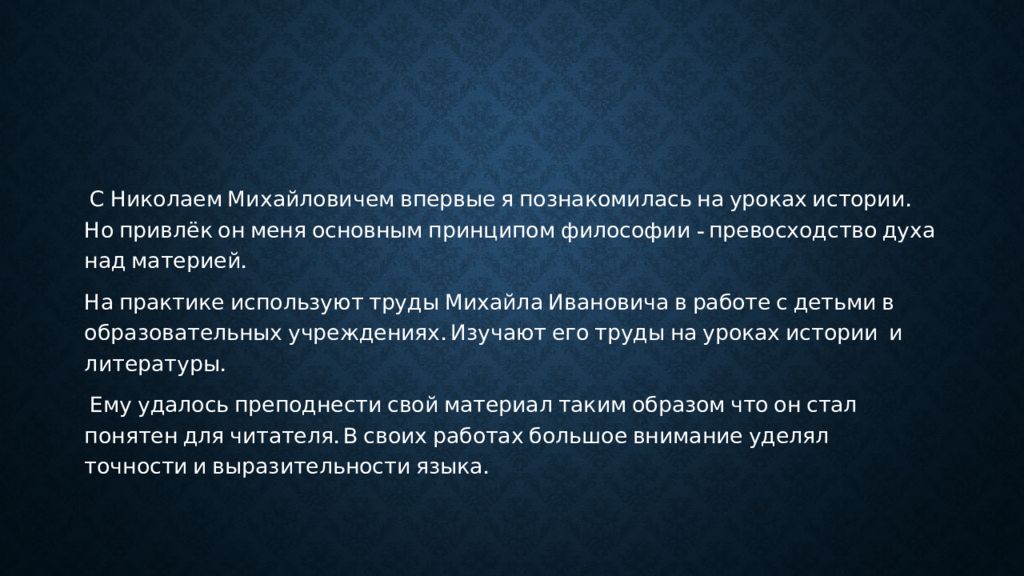 С Николаем Михайловичем впервые я познакомилась на уроках истории. Но привлёк он меня основным принципом философии - превосходство духа над материей. На практике используют труды Михайла Ивановича в работе с детьми в образовательных учреждениях. Изучают его труды на уроках истории и литературы. Ему удалось преподнести свой материал таким образом что он стал понятен для читателя. В своих работах большое внимание уделял точности и выразительности языка.