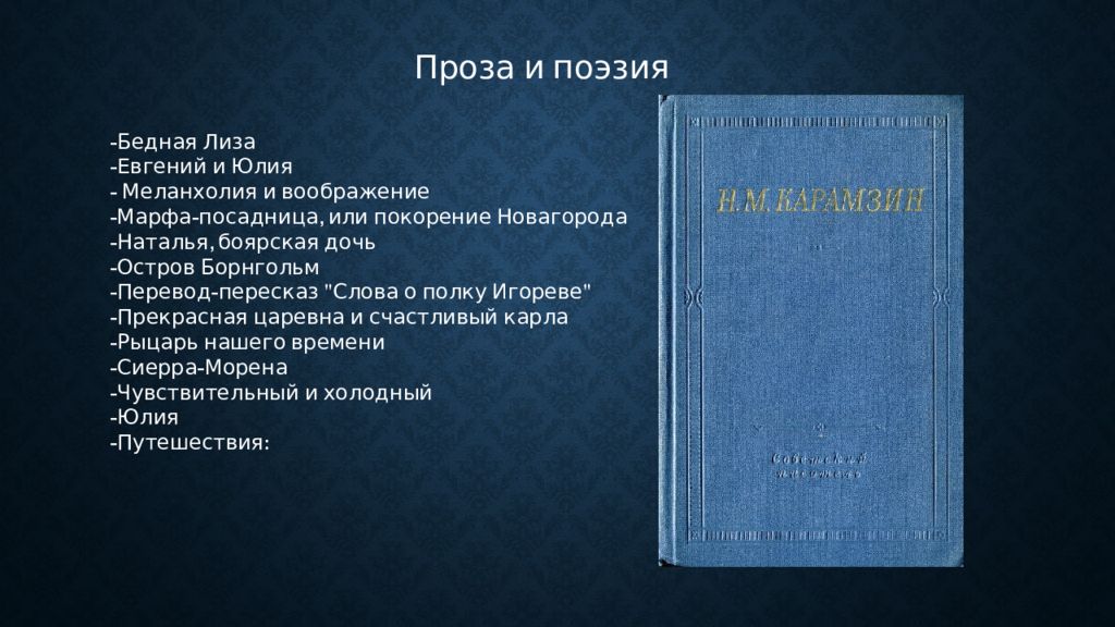 Проза и поэзия -Бедная Лиза -Евгений и Юлия - Меланхолия и воображение -Марфа-посадница, или покорение Новагорода -Наталья, боярская дочь -Остров Борнгольм -Перевод-пересказ "Слова о полку Игореве" -Прекрасная царевна и счастливый карла -Рыцарь нашего времени -Сиерра-Морена -Чувствительный и холодный -Юлия -Путешествия: