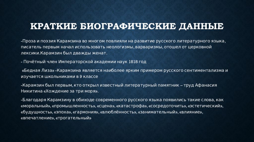 -Проза и поэзия Карамзина во многом повлияли на развитие русского литературного языка, писатель первым начал использовать неологизмы, варваризмы, отошел от церковной лексики.Карамзин был дважды женат. - Почётный член Императорской академии наук 1818 год «Бедная Лиза» -Карамзина является наиболее ярким примером русского сентиментализма и изучается школьниками в 9 классе -Карамзин был первым, кто открыл известный литературный памятник – труд Афанасия Никитина «Хождение за три моря». -Благодаря Карамзину в обиходе современного русского языка появились такие слова, как «моральный», «промышленность», «сцена», «катастрофа», «сосредоточить», «эстетический», «будущность», «эпоха», «гармония», «влюблённость», «занимательный», «влияние», «впечатление», «трогательный»