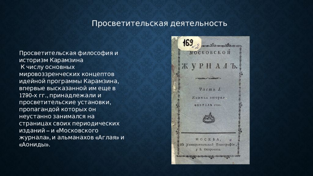 Просветительская деятельность Просветительская философия и историзм Карамзина К числу основных мировоззренческих концептов идейной программы Карамзина, впервые высказанной им еще в 1790-х гг., принадлежали и просветительские установки, пропагандой которых он неустанно занимался на страницах своих периодических изданий – и «Московского журнала», и альманахов «Аглая» и «Аониды».