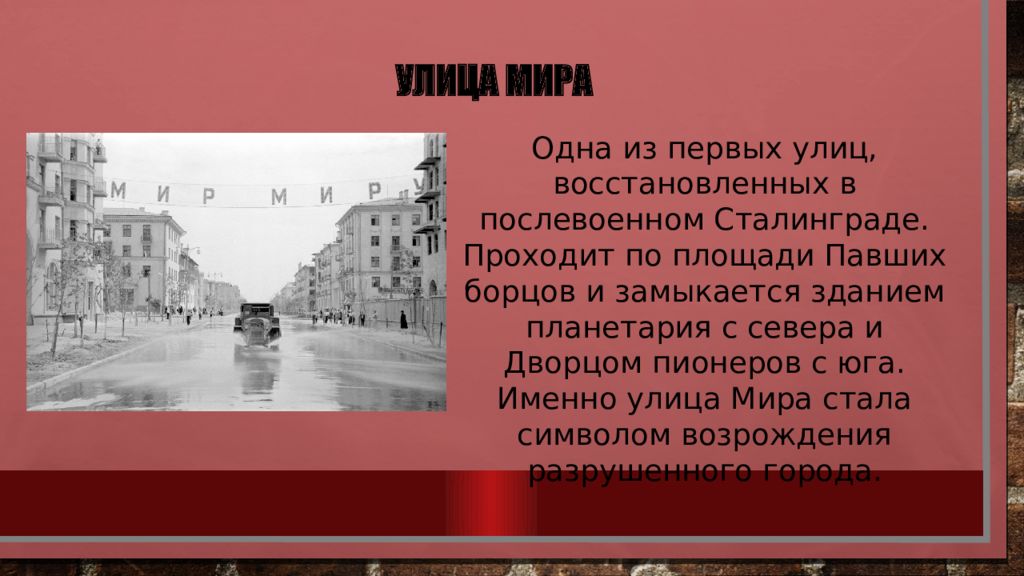 Одна из первых улиц, восстановленных в послевоенном Сталинграде. Проходит по площади Павших борцов и замыкается зданием планетария с севера и Дворцом пионеров с юга. Именно улица Мира стала символом возрождения разрушенного города.