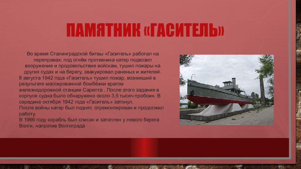 Во время Сталинградской битвы «Гаситель» работал на переправах: под огнём противника катер подвозил вооружение и продовольствие войскам, тушил пожары на других судах и на берегу, эвакуировал раненых и жителей. 8 августа 1942 года «Гаситель» тушил пожар, возникший в результате массированной бомбёжки врагом железнодорожной станции С арепта . После этого задания в корпусе судна было обнаружено около 3,5 тысяч пробоин. В середине октября 1942 года «Гаситель» затонул. После войны катер был поднят, отремонтирован и продолжил работу. В 1966 году корабль был списан и затоплен у левого берега Волги, напротив Волгограда