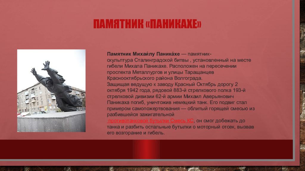 Памятник Михаи́лу Паника́хе — памятник-скульптура Сталинградской битвы , установленный на месте гибели М ихала П аникахе. Расположен на пересечении проспекта Металлургов и улицы Таращанцев Краснооктябрьского района Волгограда. Защищая ведущую к заводу Красный Октябрь дорогу 2 октября 1942 года, рядовой 883-й стрелкового полка 193-й стрелковой дивизии 62-й армии Михаил Аверьянович Паникаха погиб, уничтожив немецкий танк. Его подвиг стал примером самопожертвования — облитый горящей смесью из разбившейся зажигательной противотанковой бутылки Смесь КС, он смог добежать до танка и разбить остальные бутылки о моторный отсек, вызвав его возгорание и гибель.