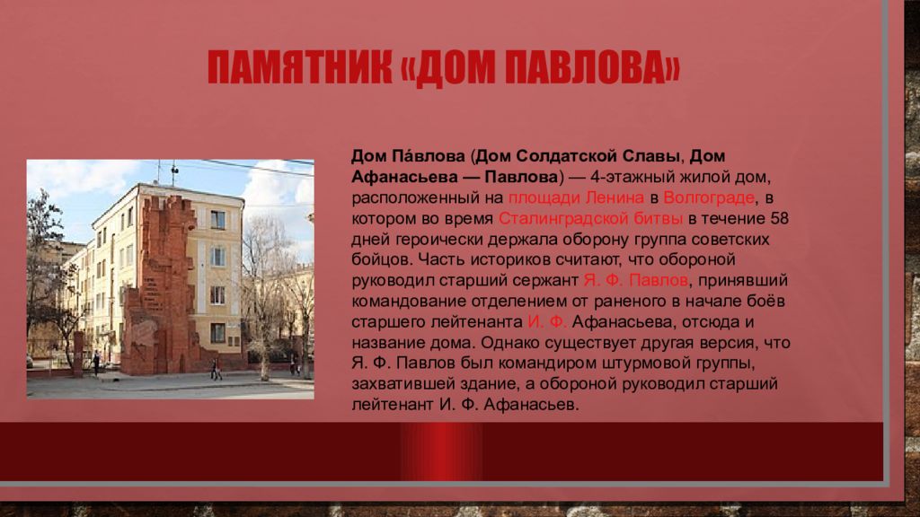 Дом Па́влова ( Дом Солдатской Славы, Дом Афанасьева — Павлова ) — 4-этажный жилой дом, расположенный на площади Ленина в Волгограде, в котором во время Сталинградской битвы в течение 58 дней героически держала оборону группа советских бойцов. Часть историков считают, что обороной руководил старший сержант Я. Ф. Павлов, принявший командование отделением от раненого в начале боёв старшего лейтенанта И. Ф. Афанасьева, отсюда и название дома. Однако существует другая версия, что Я. Ф. Павлов был командиром штурмовой группы, захватившей здание, а обороной руководил старший лейтенант И. Ф. Афанасьев.