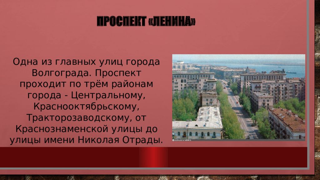 Одна из главных улиц города Волгограда. Проспект проходит по трём районам города - Центральному, Краснооктябрьскому, Тракторозаводскому, от Краснознаменской улицы до улицы имени Николая Отрады.