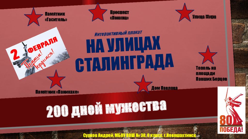 Проспект « Ленина» Улица Мира Памятник «Гаситель » Памятник « Паникахе » Дом П авлова Тополь на площади Павших Борцов Интерактивный плакат 2 00 дней мужества Сурков Андрей, МБОУ ООШ № 38, 9 класс, г.Новошахтинск