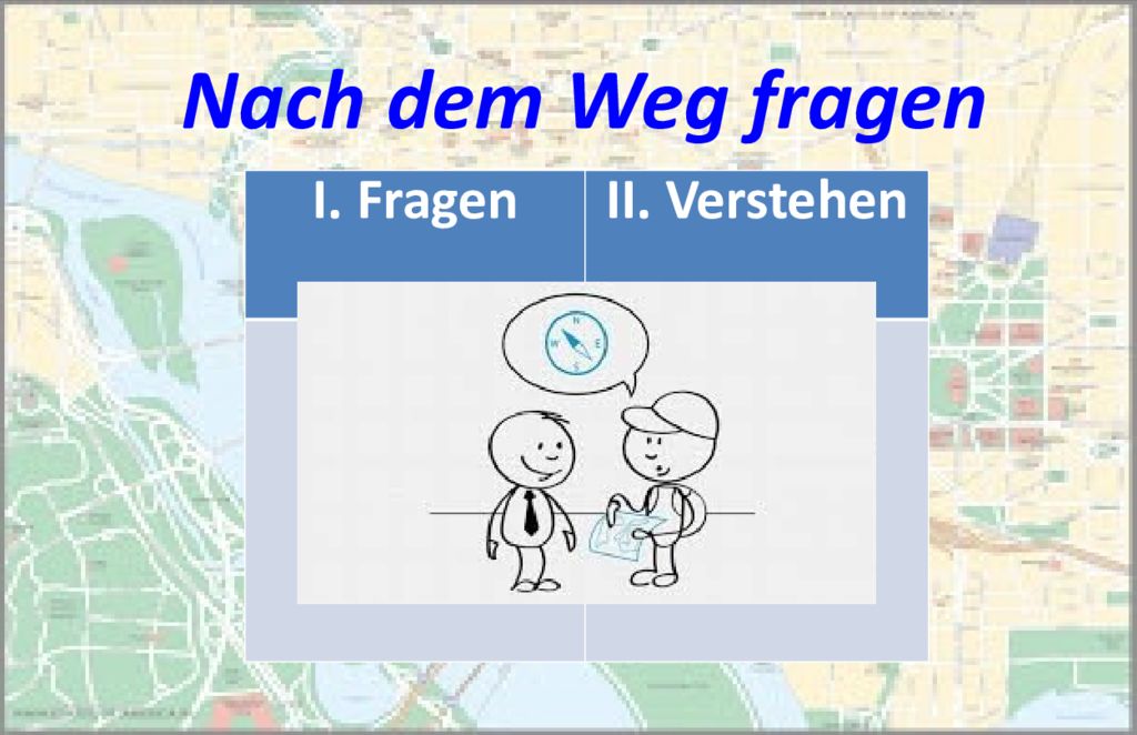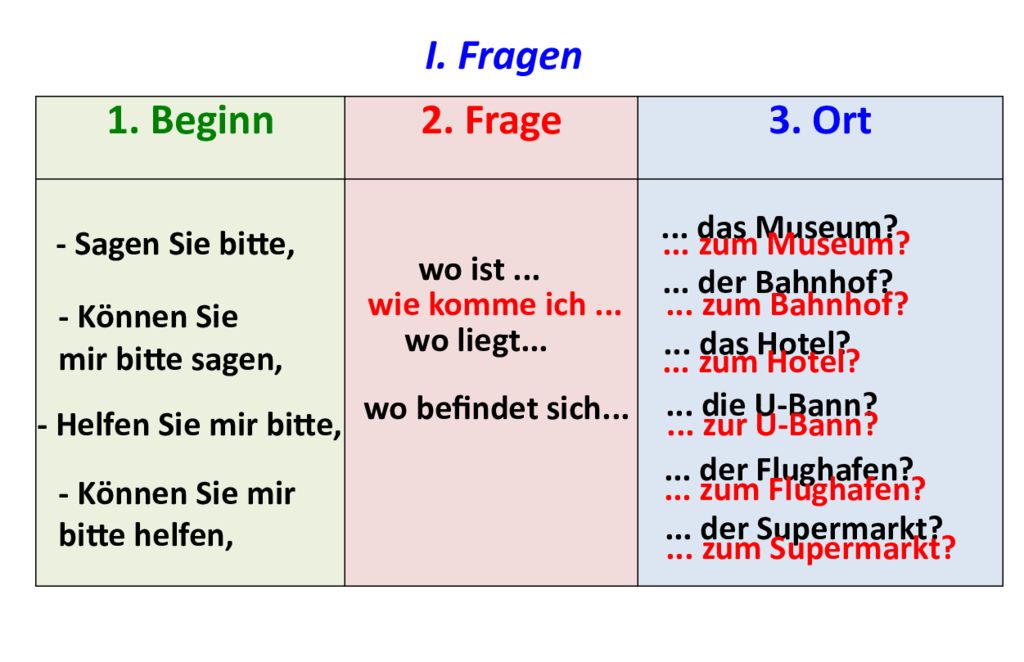 I. Fragen 1. Beginn 2. Frage 3. Ort - Sagen Sie bitte, - Können Sie mir bitte sagen, - Helfen Sie mir bitte, - Können Sie mir bitte helfen, wo ist... wo liegt... wo befindet sich... ... das Museum? ... der Bahnhof? ... das Hotel? ... die U-Bann? ... der Flughafen? ... der Supermarkt? wie komme ich... ... zum Museum? ... zum Bahnhof? ... zum Hotel? ... zur U-Bann? ... zum Flughafen? ... zum Supermarkt?