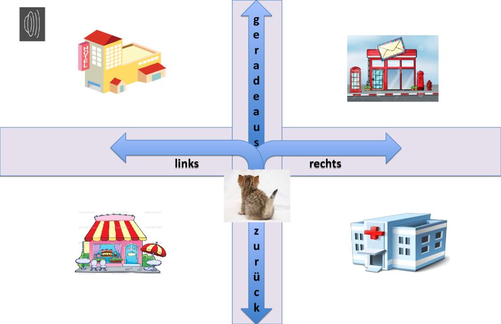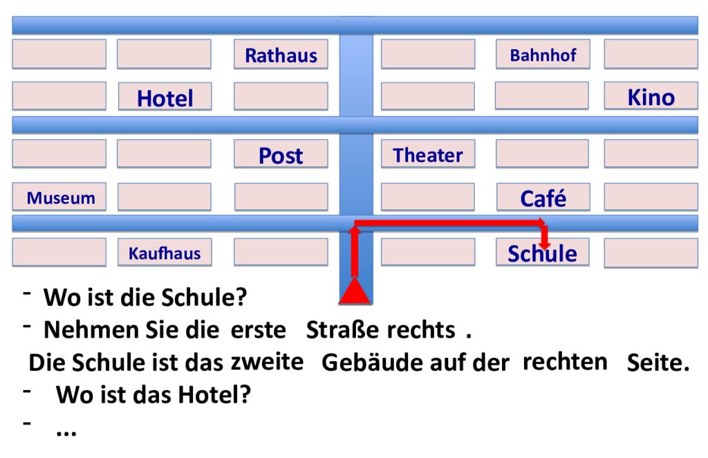 Rathaus Bahnhof Post Theater Kaufhaus Schule Wo ist die Schule? Nehmen Sie die Straße. Die Schule ist das Gebäude auf der Seite. Wo ist das Hotel? ... Café Hotel Kino Museum erste rechts zweite rechten
