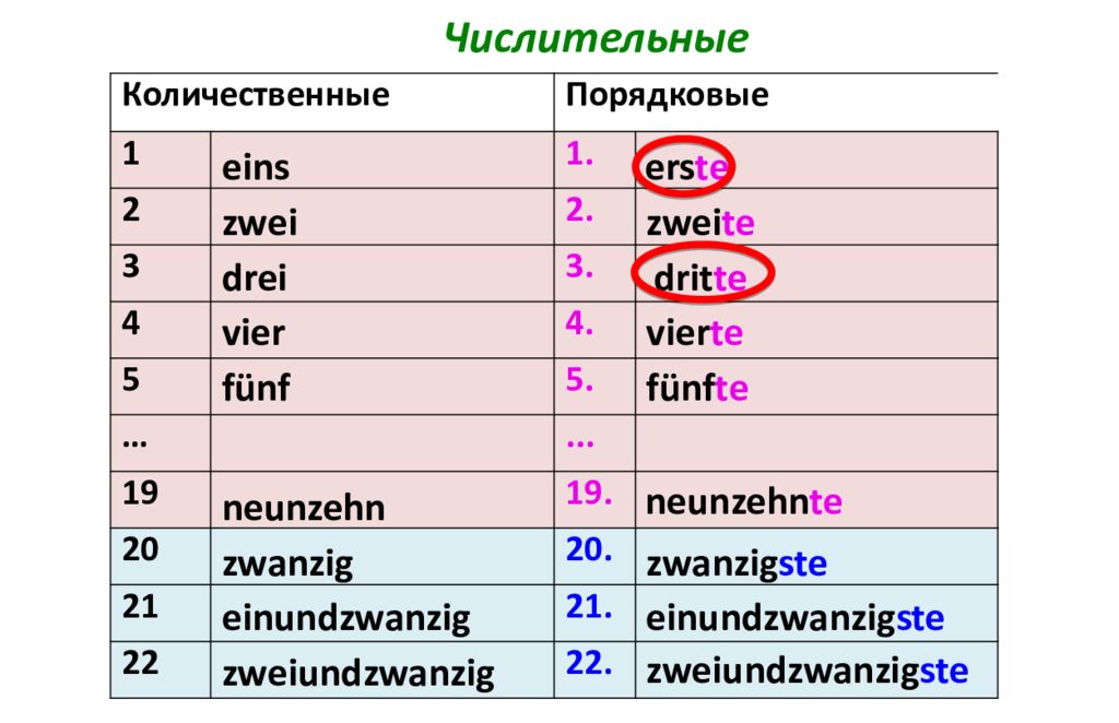 Количественные Порядковые 1 1. 2 2. 3 3. 4 4. 5 5. … ... 19 19. 20 20. 21 21. 22 22. Числительные eins zwei drei vier fünf neunzehn zwanzig einundzwanzig zweiundzwanzig ers te zwei te drit te vier te fünf te neunzehn te zwanzig ste einundzwanzig ste zweiundzwanzig ste