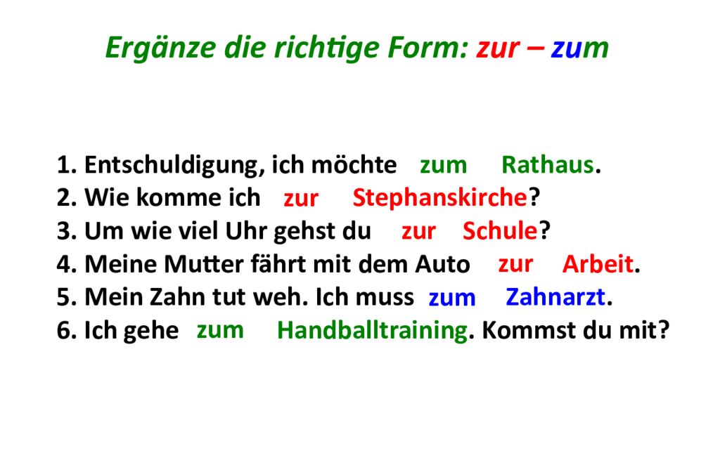 Ergänze die richtige Form: zur – zu m Entschuldigung, ich möchte... Rathaus. Wie komme ich... Stephanskirche ? Um wie viel Uhr gehst du... Schule ? Meine Mutter fährt mit dem Auto... Arbeit. Mein Zahn tut weh. Ich muss... Zahnarzt. Ich gehe... Handballtraining. Kommst du mit? zum zum zum zur zur zur