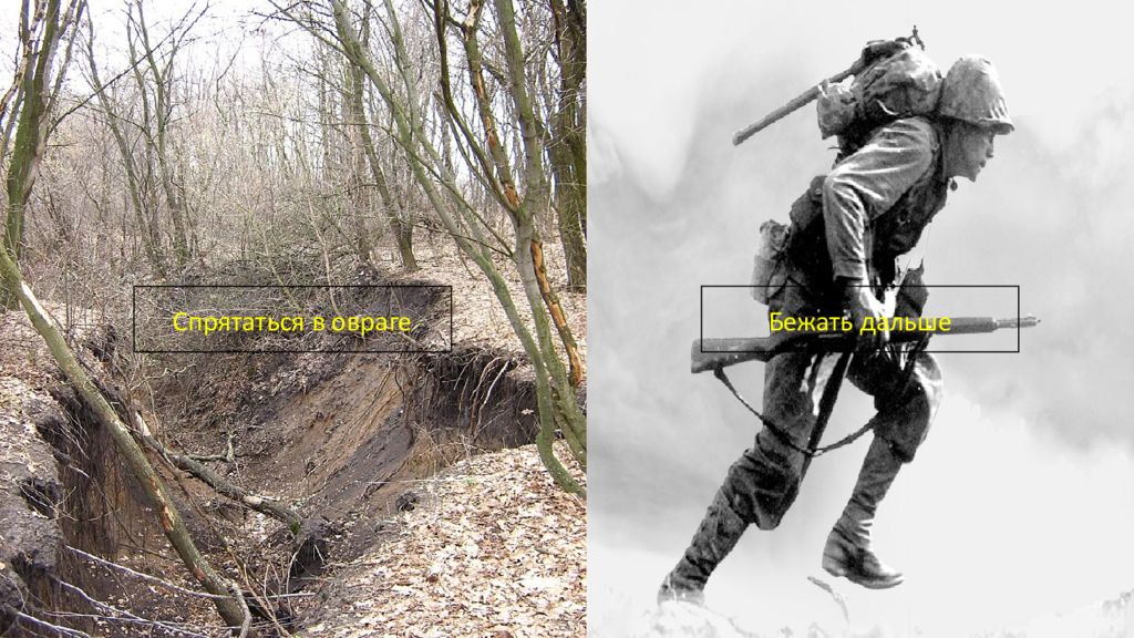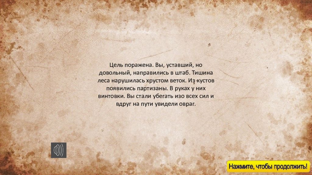 Цель поражена. Вы, уставший, но довольный, направились в штаб. Тишина леса нарушилась хрустом веток. Из кустов появились партизаны. В руках у них винтовки. Вы стали убегать изо всех сил и вдруг на пути увидели овраг.
