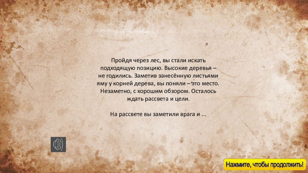 Пройдя через лес, вы стали искать подходящую позицию. Высокие деревья – не годились. Заметив занесённую листьями яму у корней дерева, вы поняли – это место. Незаметно, с хорошим обзором. Осталось ждать рассвета и цели. На рассвете вы заметили врага и...